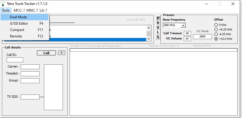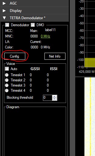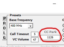 6) Ställ in CC park. Detta är den frekvens som kontrollkanalen i TETRA-nätet sänder på. Tänk på CC Park som ett kanalnummer, där varje kanal är 25KHz. Dvs om vi vill lyssna på 428,150 MHz så är det 28,15 MHz – eller 28 150 KHz upp från 400MHz. 28 150 / 25 = 1126. Alltså skriver vi in 1126 för CC Park.